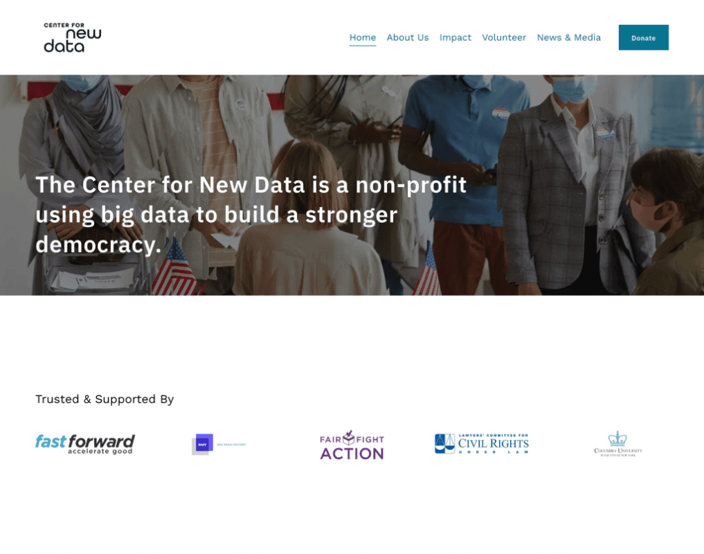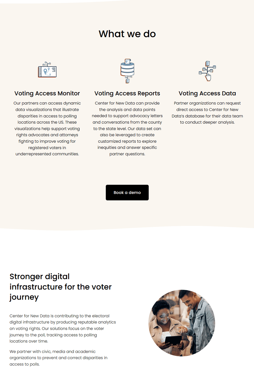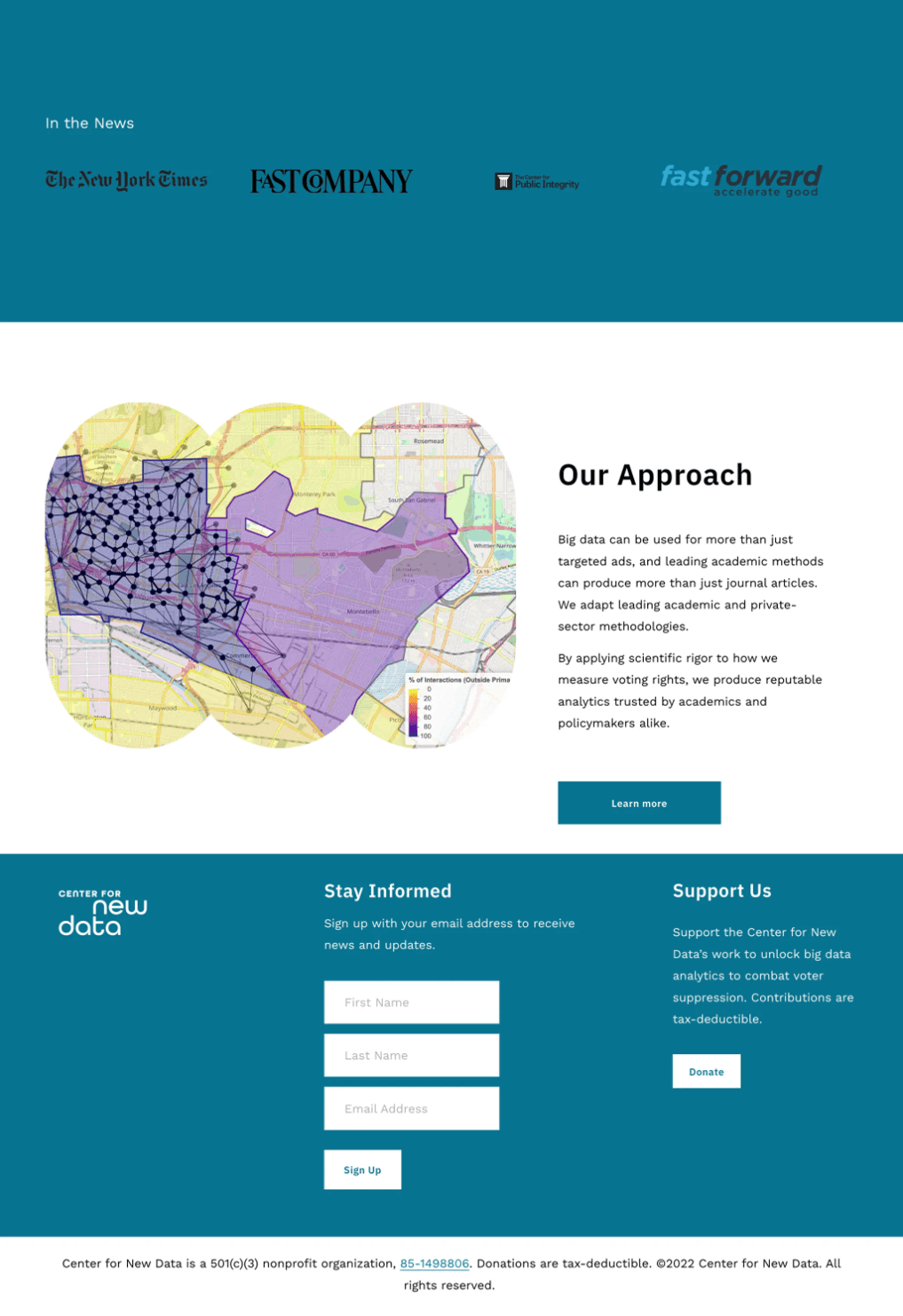 As a UX designer for Develop for Good, I partnered with the Center for New Data (CND), a civic tech non profit, to redesign their website and strengthen how they communicate their mission of protecting voting rights through data science and AI.