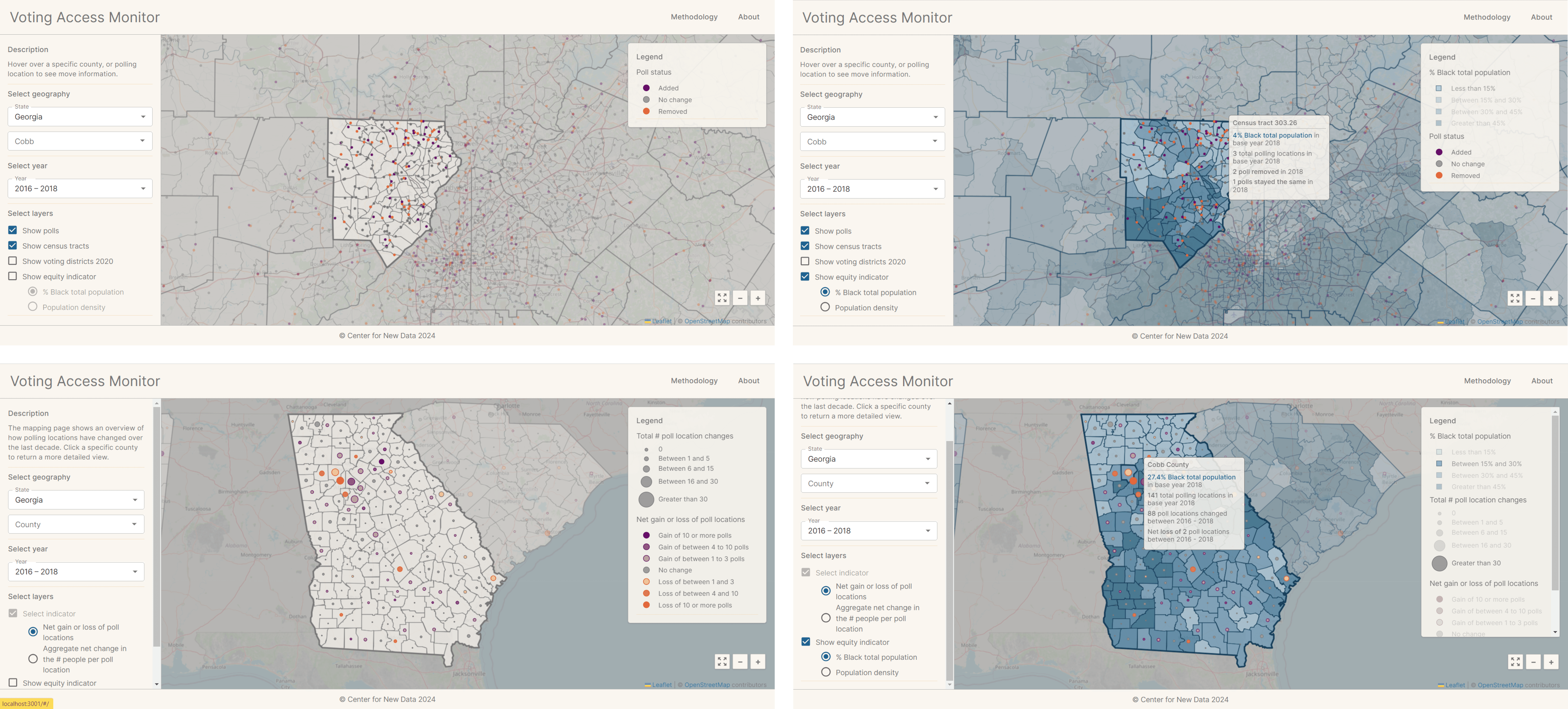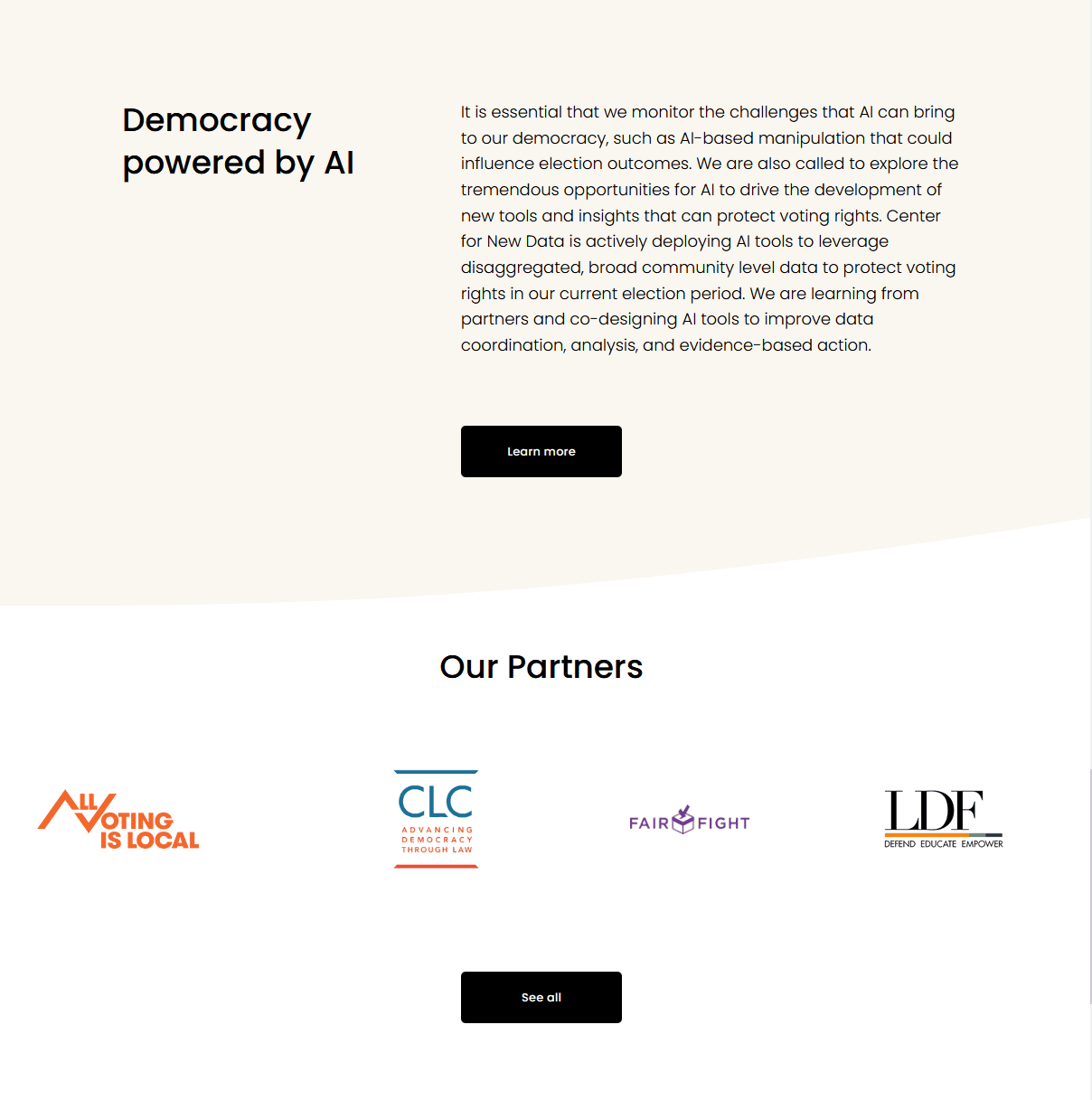The Center for New Data (CND) is a non-profit non-partisan organization that uses data science and AI to protect voting rights. This is done through the Voting Access Monitor, that helps journalists, researchers, and civic partners identify voting barriers and advocate for equitable access to the polls.